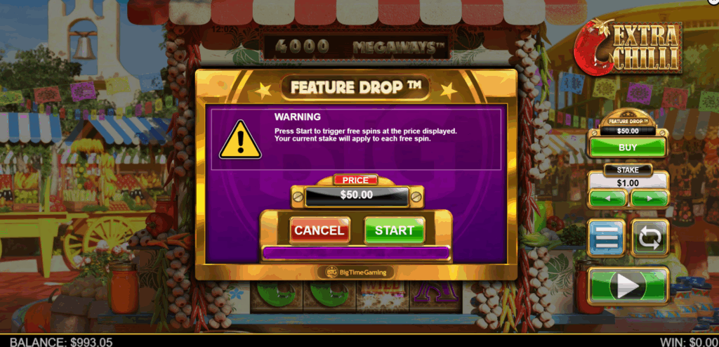 One of the standout features of Extra Chilli Megaways slot is the Feature Drop function, which is a type of Bonus Buy, allowing players to purchase the free spins round directly. Depending on their account balance, players can jump straight into the Free Spin Gamble with the hope of winning big.